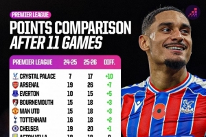 英超相比上賽季積分變化:水晶宮+10分、阿森納+7分、利物浦-10分