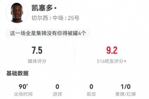 體育資訊12月20日訊 切爾西在本輪英超2-2戰(zhàn)平紐卡,凱塞多本場(chǎng)數(shù)據(jù)如下: