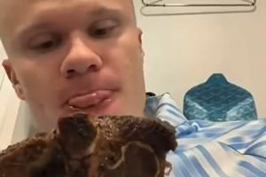 哈蘭德在社交媒體上曬出了一段視頻,視頻中,他坐在更衣室里,手拿著一塊帶骨牛排對著鏡頭一頓猛啃,邊吃還舔嘴,看得出他吃得很香。