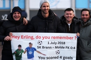 拉德林格提到了2018年哈蘭德身披莫爾德球衣對陣布蘭時,對他上演大四喜的往事。牌子上寫道:“嗨,埃爾林,你記得嗎?2018年7月1日,莫爾德4-0布蘭,你對我打進了4球!能請你把你的球衣送給我嗎?”
