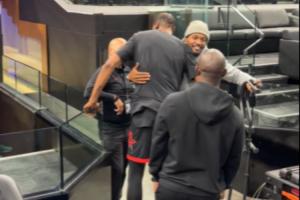 賽前,比爾與杜蘭特?fù)肀е乱?,兩人在太?yáng)做過(guò)隊(duì)友。