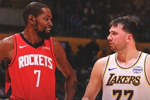 賽后火箭官推發(fā)布贏球海報(bào),杜蘭特和東契奇對(duì)視瞬間成為封面。