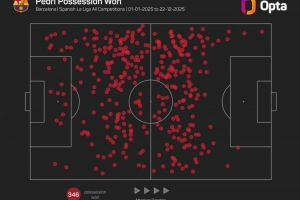 數(shù)據(jù)統(tǒng)計顯示,佩德里在2025年各項賽事共計346次奪回球權(quán),是五大聯(lián)賽同期非門將球員最多。