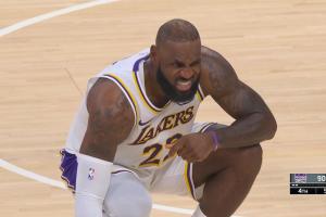 GIF-德羅贊擠掩護(hù)時(shí)這下肘到了詹姆斯的腰 有些不舒服 隨后被換下了