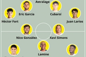 中場(chǎng):哈維·西蒙斯、尼科·岡薩雷斯、安蘇·法蒂、亞馬爾、阿霍馬克