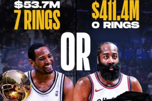 詹姆斯-哈登的(薪資)收入已經(jīng)超過(guò)了4.11億美元,但NBA生涯至今冠軍數(shù)仍是0。