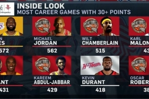 火箭主場迎戰(zhàn)步行者,轉(zhuǎn)播方曬出歷史30+場次排名,杜蘭特418場排名第七。
