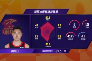 常規(guī)賽第二周周最佳球員賀希寧本場比賽發(fā)揮出色,他18次出手命中11球,得到賽季新高的29分。末節(jié)決勝時刻,賀希寧接管了比賽,他包辦了球隊最后12分中的10分。身體強壯的深圳后衛(wèi)先是突破造成付豪犯規(guī)打成2+1,隨后又在轉(zhuǎn)換進攻中上籃得手。最后1分20秒,賀希寧再次突破打成2+1,當(dāng)他站上罰球線時,主場球迷高喊起了“MVP”。