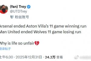 曼聯(lián)球迷:阿森納終結了維拉的11連勝,曼聯(lián)終結了狼隊的11連敗,為什么生活這么不公平!??