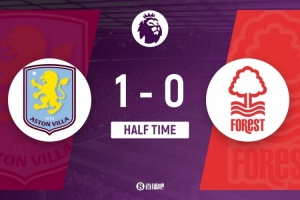 傷停補(bǔ)時(shí)1分鐘。上半場(chǎng)比賽結(jié)束,阿斯頓維拉1-0諾丁漢森林。