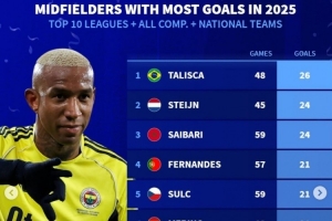 體育資訊1月4日訊 《轉(zhuǎn)會(huì)市場(chǎng)》統(tǒng)計(jì)了2025年前十聯(lián)賽中場(chǎng)的俱樂(lè)部+國(guó)家隊(duì)各項(xiàng)賽事進(jìn)球最多情況,塔利斯卡居首。