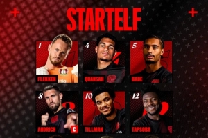 勒沃庫森首發(fā):1-弗萊肯、4-寬薩、5-巴代、8-安德里希、10-蒂爾曼、12-塔普索巴、14-???、20-格里馬爾多、21-巴斯克斯、23-內(nèi)森-泰拉、25-帕拉西奧斯