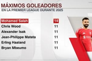 這是薩拉赫在2025年英超打進的第14球,領(lǐng)跑所有球員,并列次席的伍德、伊薩克、馬特塔、哈蘭德以及姆伯莫均是打進11球。