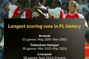 體育資訊9月15日訊 在本輪英超,利物浦1-0擊敗伯恩利,延續(xù)了球隊(duì)連續(xù)進(jìn)球場次紀(jì)錄。以下為英超歷史連場破門紀(jì)錄榜: