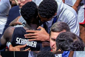 比賽賽后,同時(shí)入選最佳陣容的字母哥和施羅德?lián)肀е乱狻?duì)此,施羅德表示:“揚(yáng)尼斯做出了非常棒的舉動(dòng),他主動(dòng)來(lái)找我,說(shuō)我們各自代表德國(guó)和希臘為國(guó)征戰(zhàn),而他這次也終于為希臘隊(duì)贏得了首枚大賽獎(jiǎng)牌。我對(duì)他只有敬佩——他有四個(gè)可愛(ài)的孩子、賢惠的妻子,還有始終陪伴他的兄弟,一家人都在為籃球事業(yè)努力。更不用說(shuō)他在NBA賽場(chǎng)上的表現(xiàn),那完全是另一個(gè)級(jí)別的存在,絕對(duì)是世界頂尖球員之一。他主動(dòng)過(guò)來(lái)和我交流,這種舉動(dòng)充滿了體育精神,非常難得。他還說(shuō)一直在看我們球隊(duì)的YouTube視頻,我覺(jué)得這種跨國(guó)家的球員互動(dòng),對(duì)希臘和德國(guó)的籃球交流也很有意義?!?/p>