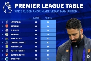 德轉(zhuǎn)列自阿莫林執(zhí)教曼聯(lián)以來(lái)各隊(duì)在英超取得的積分情況,阿莫林帶隊(duì)31輪僅取得31分,僅高于上賽季三支英超降級(jí)隊(duì),距第1名31輪取得68分的利物浦相差37分。