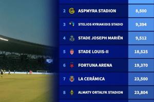 體育資訊9月18日訊 德國轉(zhuǎn)會(huì)市場(chǎng)列出了本賽季歐冠容量最小球場(chǎng)排名,卡拉巴赫主場(chǎng)5800人居首,博德閃耀主場(chǎng)8500人次席。