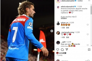 馬競(jìng)官方曬出格列茲曼的照片,確認(rèn)此役是他為馬競(jìng)出戰(zhàn)的第450場(chǎng)比賽,格列茲曼為馬競(jìng)貢獻(xiàn)198球93助,隨隊(duì)贏得1次西超杯冠軍、1次歐聯(lián)杯冠軍、1次歐超杯冠軍。