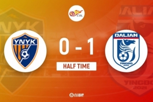 傷停補(bǔ)時3分鐘。上半場比賽結(jié)束,云南玉昆0-1大連英博。