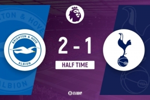 傷停補(bǔ)時(shí)3分鐘。上半場比賽結(jié)束,布萊頓2-1熱刺。