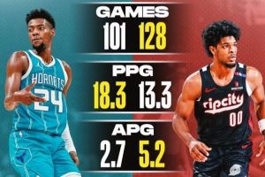 美媒Cluthpoints曬圖,對(duì)比了2023年榜眼米勒和探花亨德森的數(shù)據(jù),米勒出戰(zhàn)101場(chǎng),場(chǎng)均18.3分2.7助攻4.4籃板,命中率42.8%,亨德森出戰(zhàn)128場(chǎng),場(chǎng)均13.3分5.2助攻3.1籃板,命中率40.1%,并寫道: