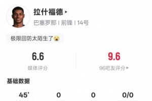 體育資訊9月22日訊 2025-26賽季西甲第5輪,巴薩3-0赫塔費(fèi)。拉什福德下半場替補(bǔ)出戰(zhàn),2次射正全場最多,傳球成功率93.8%,評(píng)分6.6。