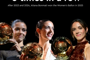 邦馬蒂成為女足金球獎(jiǎng)歷史上最成功的球員,連續(xù)三次奪得金球獎(jiǎng),加入了克魯伊夫、普拉蒂尼和范巴斯滕等男足傳奇的行列。盡管她在個(gè)人表現(xiàn)上取得了巨大成功,但巴薩女足在歐冠決賽中失利以及西班牙女足國家隊(duì)在歐洲杯決賽中的失敗讓她感到遺憾。不過,她的出色表現(xiàn)使她成為了這兩項(xiàng)賽事的最佳球員。
