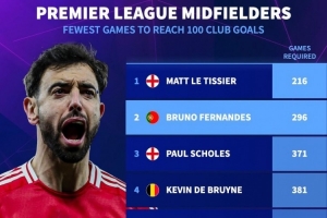 據(jù)德國轉(zhuǎn)會(huì)市場統(tǒng)計(jì),B費(fèi)已為曼聯(lián)打進(jìn)100球,英超時(shí)代只有8名中場球員為俱樂部(所有賽事)打進(jìn)100球,而B費(fèi)是所用場次第2少的中場球員。