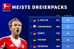 體育資訊09月23日訊 德轉(zhuǎn)統(tǒng)計(jì)了德甲歷史帽子戲法榜,蓋德穆勒32次帽子戲法斷層領(lǐng)先,凱恩僅用67場(chǎng)就排在歷史第7。