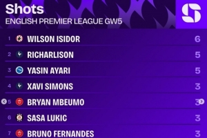體育資訊9月24日訊 英超第5輪戰(zhàn)罷,squawkafootball列各項數(shù)據(jù)排行,桑德蘭前鋒伊西多是本輪射門次數(shù)最多的球員,共6次。