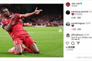 此役伊薩克斬獲紅軍生涯首球,他在社媒曬出比賽照片,慶祝球隊(duì)取勝+攻入處子球。