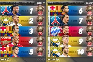 體育資訊09月25日訊 外媒Score 90排無金球球員TOP10,內(nèi)馬爾居首,姆巴佩第二,伊涅斯塔第三。