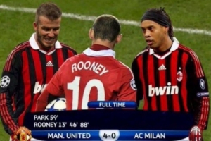 尷尬的是,這張圖片是一張P圖。2009-10賽季歐冠1/8決賽次回合,曼聯(lián)確實(shí)4-0擊敗了米蘭,但是魯尼在那場比賽打進(jìn)2球,另外兩球是樸智星和弗萊徹打進(jìn),而且米蘭那場比賽身穿的是黑色球衣,也不是圖片里的紅黑間條衫。