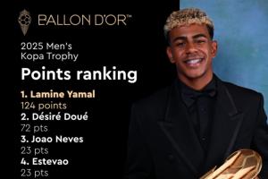體育資訊09月27日訊 金球獎(jiǎng)官方今天公布了男子科帕獎(jiǎng)的得分細(xì)節(jié),其中亞馬爾124分成功衛(wèi)冕,以52分的優(yōu)勢領(lǐng)先于獲得72分的杜埃。阿森納小將斯凱利和里爾小將布阿迪未能在評選中獲得分?jǐn)?shù)。