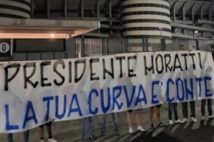 國(guó)米球迷組織北看臺(tái)拉出橫幅,為莫拉蒂送上祝福,上面寫著:“莫拉蒂主席,你的北看臺(tái)與你同在?!?/p>