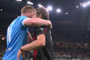 體育資訊09月29日訊 本輪十人米蘭2-1擊敗那不勒斯,賽后,德布勞內(nèi)與莫德里奇擁抱致意。
