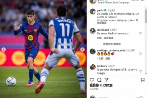 佩德里當(dāng)選本場(chǎng)比賽最佳球員,賽后他在社交媒體上曬出比賽照片,配文:“重回蒙特惠奇球場(chǎng),重返西甲榜首。一如既往的快樂(lè),巴薩球迷們?!?/p>