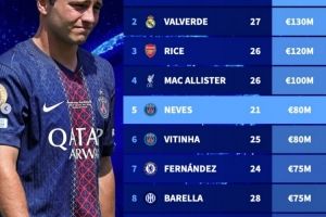 體育資訊9月30日訊 此前有報(bào)道稱曼城等球隊(duì)有意引進(jìn)巴黎球員內(nèi)維斯,德轉(zhuǎn)也盤點(diǎn)了目前世界足壇中前衛(wèi)球員身價(jià)榜,其中佩德里以1.4億歐居首,內(nèi)維斯高居第五。具體如下: