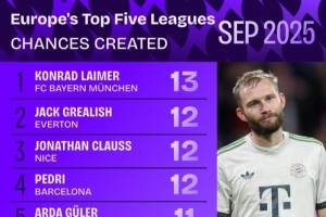 體育資訊10月1日訊 Squawka統(tǒng)計了歐洲五大聯(lián)賽球員在9月份的創(chuàng)造機會次數(shù)榜單,拜仁中場萊默爾位列第一。