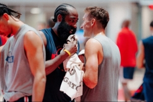 體育資訊10月2日訊 今天,快船官方曬出了球隊訓(xùn)練營第二天的照片,哈登和博格丹喜笑顏開。
