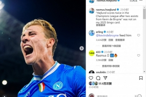 霍伊倫社媒曬出比賽照片,并寫(xiě)道:“霍伊倫在歐冠比賽中梅開(kāi)二度,還都是德布勞內(nèi)的助攻——這完全不在我2025年的劇本之中?!?/p>