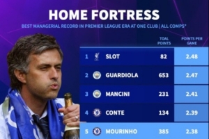 附英超執(zhí)教單一俱樂部主場場均得分榜(至少25場比賽):