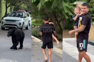 視頻中一頭熊慢慢騰騰的在公路上走著,科雷亞抱著2歲的女兒莉亞連連后退。