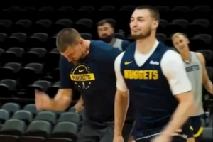 視頻當(dāng)中,約基奇和布勞恩賽跑,約基奇步履踉蹌,布勞恩率先到達(dá)終點(diǎn)后比出獲勝手勢。