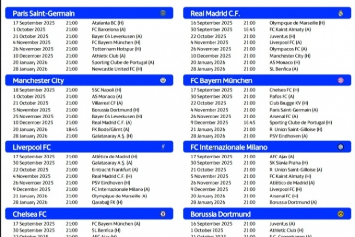 以下是歐冠主要球隊(duì)的賽程(以下均為北京時間):