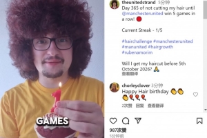 蓄發(fā)哥社媒曬出紀(jì)念蓄發(fā)一周年視頻,配文:“不剪頭發(fā)直到曼聯(lián)5連勝,已過去365天,當(dāng)前連勝狀態(tài)——1/5。”