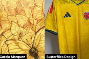 哥倫比亞世界杯主場球衣的獨特之處在于其蝴蝶圖案,以此向哥倫比亞作家馬爾克斯致敬,象征著希望、變革和愛的黃色蝴蝶在他的作品中頻繁出現(xiàn)。