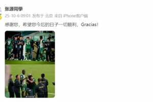 體育資訊10月6日訊 昨晚,北京國安俱樂部官方宣布主帥塞蒂恩離任。國安球員張源更新個人微博,向塞蒂恩送上祝福。