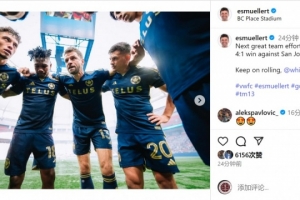 穆勒社媒曬出與隊友的合照,配文:“又一場出色的團隊表現(xiàn),4-1擊敗圣何塞。繼續(xù)前進,溫哥華白浪!”