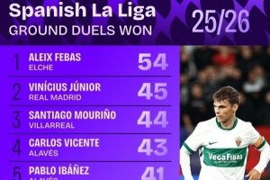 體育資訊10月7日訊 日前,Squawka統(tǒng)計了本賽季西甲地面拼搶成功次數(shù)排行,維尼修斯45次第二,姆巴佩40次第七。